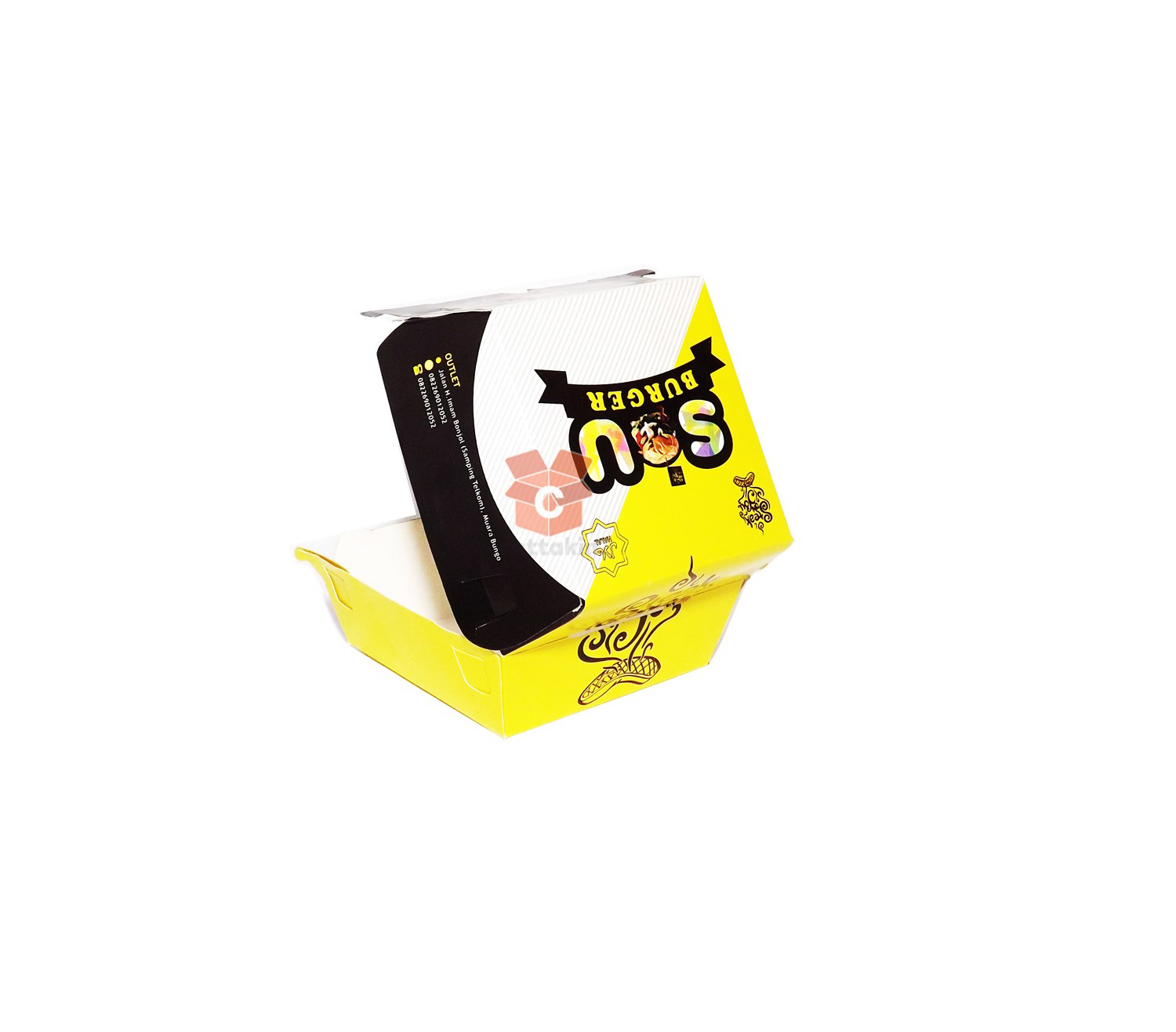 Box burger khusus untuk makanan burger. Untuk makanan basah atau berminyak sebaiknya bagian dalam di Laminasi